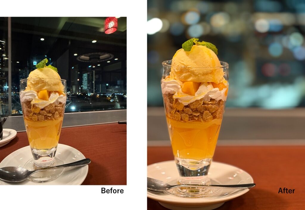 スマホカメラアプリにある「ポートレート」機能。被写体を認識して自動で背景をぼかし、写真に立体感や、メニュー写真なら、よりシズル感を与えてくれます。iPhoneをはじめとして、撮影後にもぼかし具合は調整することができます。簡単にPR力を高められますし、プロフェッショナルな印象の撮影ができますよ!