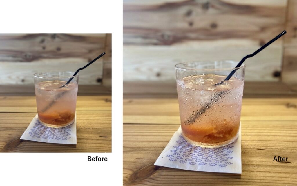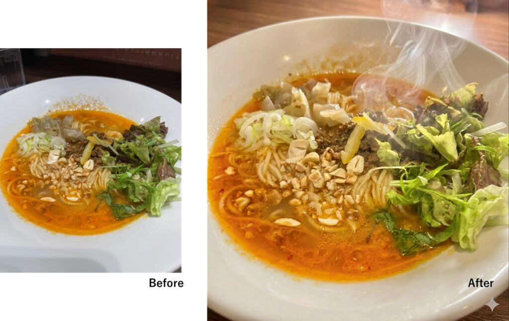 GeminiなどのAIを使うと、らーめんに湯気を足したり、ビールやドリンクを冷えて美味しそうに見せることもできます。