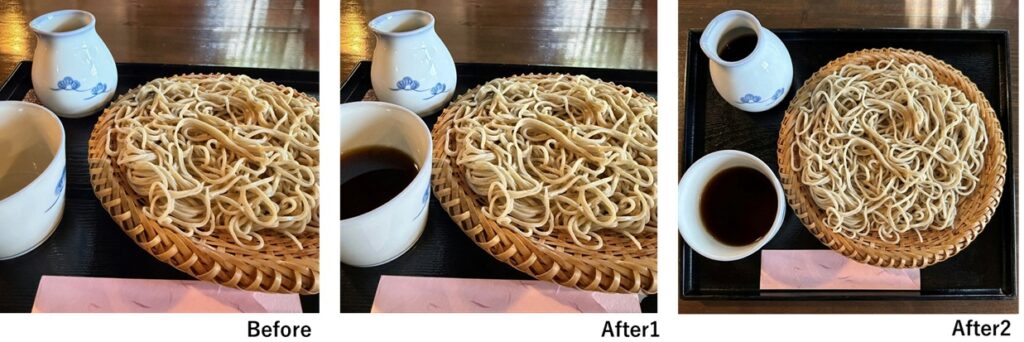 番外編のご紹介として…お蕎麦の撮影をしたら、「蕎麦つゆ」を蕎麦猪口に入れていなかった!そんな場合も、AIに簡単に蕎麦つゆを足してもらえます。また、真上からの写真をつくってもらう事もできます。