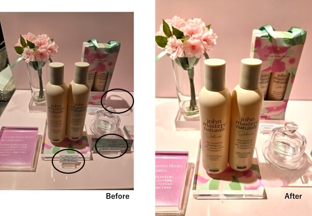 (左)「プライス」や「商品の影」が写り、色調も暗め(右)クリーンアップを使って「プライス」「影」を自然に消去、色調を補正しました。